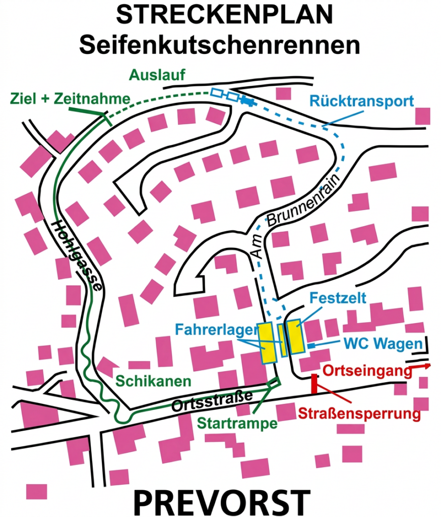 Gestartet wird einzeln von der Startrampe mit Auslösung der Lichtschranke der elektronischen Zeitnahme. Nach der 100 m langen Geraden auf der Ortsstraße die erste große Schikane als Bremskurve für die Fahrt durch die Hohlgasse. Im oberen Teil der Hohlgasse noch weitere kleine Schikanen, um die Geschwindigkeit nicht zu hoch werden zu lassen. Danach freie Fahrt mit abschließender Rechtskurve durch das Ziel. Zeitmessung am Ziel durch eine Lichtschranke. Der Rücktransport der Fahrzeuge erfolgt durch das Neubaugebiet. Die Fahrzeuge werden von Hand auf zwei landwirtschaftliche Anhänger auf- und abgeladen.